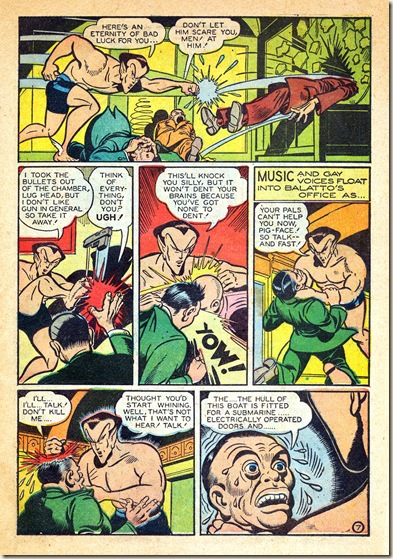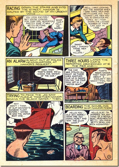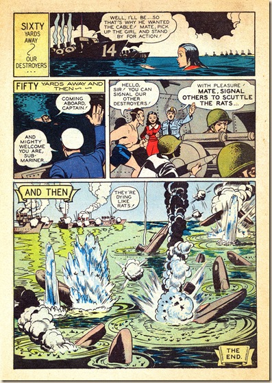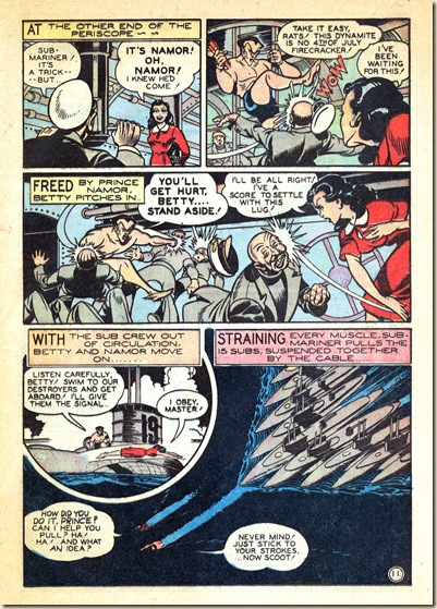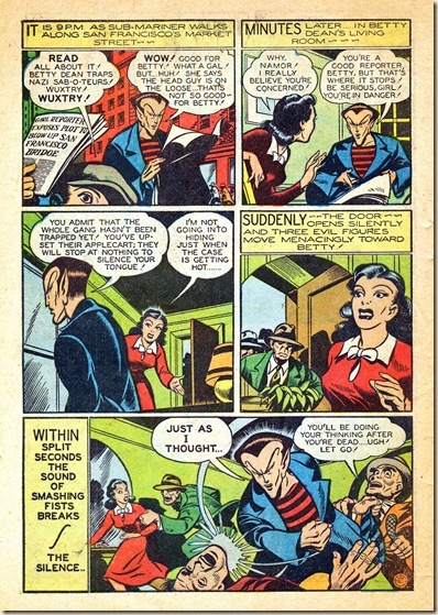 As grim as this non-PC wartime story is, Thompson’s art delivers the typical Timely 12-page opus of Armageddon with unexpected humor and elegance. For instance, consider the page 10 bitch-slap, or the stunningly drawn shipworks interior on page 8, top right. It’s worth looking at this story a second time to savor its juicy visual tidbits (something many have wanted to do with Prince Namor, no doubt!). Even though Thompson did not write these – or most of his post-David-McKay work – his robust style makes him almost a co-writer, in many cases.