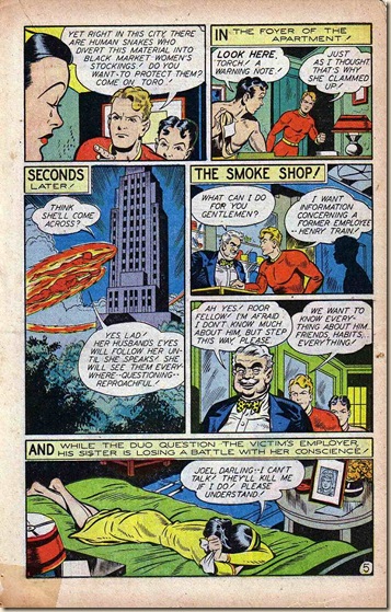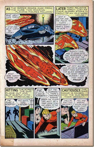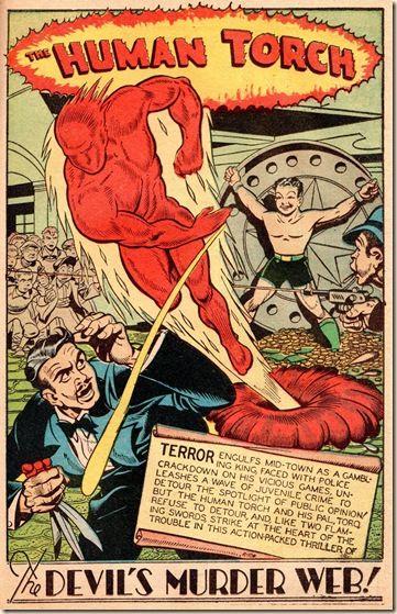 The mystery remains, but so does his work. We’ll close with a stunning (and nicely scanned – thank you, scanners!) HUMAN TORCH story from DARING COMICS #12 (Summer 1945). There is