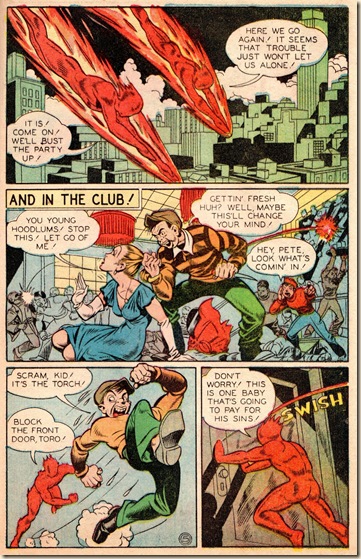 Sadly, unlike Cole and Eisner, who enjoyed success and recognition, Thompson’s work, after he left David McKay, never transcended the back-up stories level for DC and Timely. At DC he was often forced to create cramped 4-6 page stories that rushed by breathlessly. Timely's back-up stories were often longer than DC’s–one of the many ways the companies differentiated themselves. Thompson’s Timely work sometimes spread out to 12 pages. As well, Thompson was given the chance to draw stories featuring major characters, such as in this beautifully designed and rendered HUMAN TORCH story from Timely’s All Select #9 (Fall 1945):