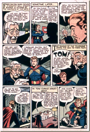 On page five, the center panel calls attention to its central figures. Thompson places them front and center, as if they are on a stage and the reader has front row seats. This creates a delightful theatricality to the “performance” of the characters at a time when most comic book stories were influenced by the movies. In fact, this is, in some ways, the perfect Jimmy Thompson page, with the jaw-dropping art deco cityscape in panel one, the antic exaggeration of the running figure in panel three, and Thompson’s masterful placement of speech balloons and typographical elements.